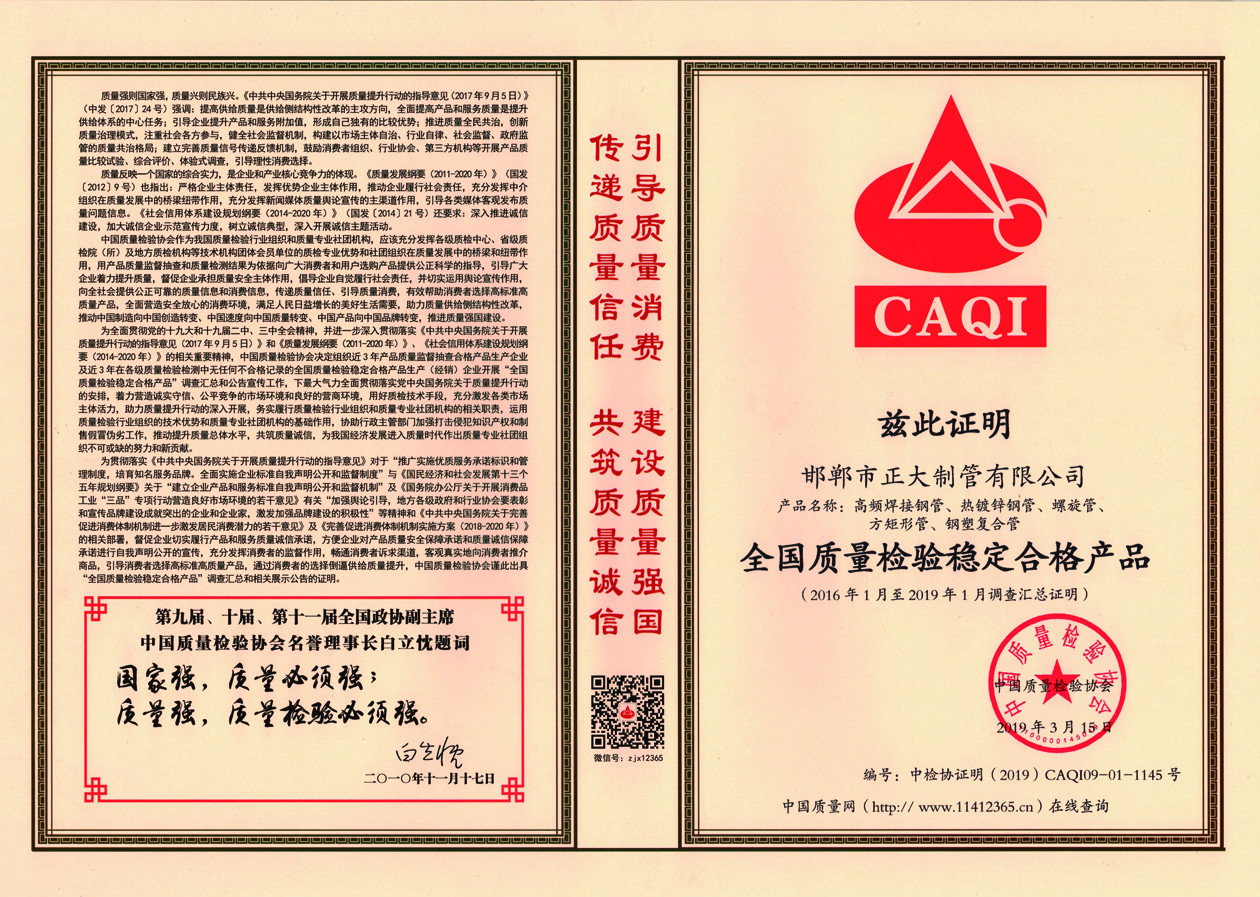 正大制管榮獲“全國質量檢驗穩定合格產品”和“全國產品和服務質量誠信示范企業”